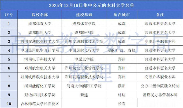 2025年12月19日,是个周五,距离2026年仅剩下8个工作日,也是十四五圆满收官最后几天。由于高校的设置一般需要5至7天的公示时间,各省份纷纷抢着年关前,对筹建的新本科大学进行公示,以便在新年到来之前,完成公示并向教育部进行申报高校设置事项。这就有今天一天有四个省部级单位集中公示10所新的本科大学现象的出现。