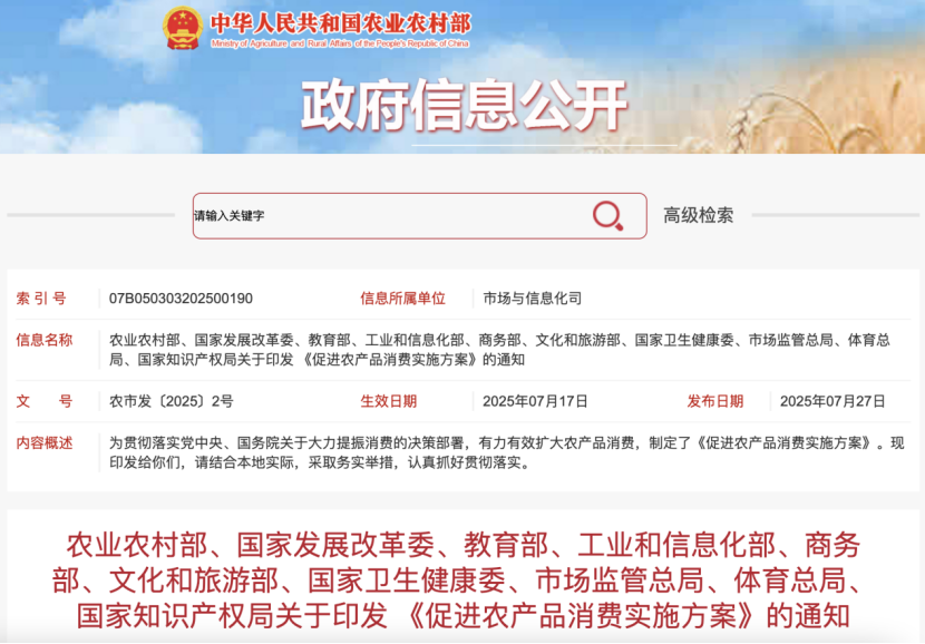7月27日,据农业农村部网站消息,农业农村部、国家发展改革委、教育部、工业和信息化部、商务部、文化和旅游部、国家卫生健康委、市场监管总局、体育总局、国家知识产权局联合印发《促进农产品消费实施方案》(以下简称《实施方案》),部署了九方面举措,提出优化供给端、创新流通端、激活市场端,释放多样化、品质化、差异化消费潜力,引领供需结构升级,有力有效扩大农产品消费。